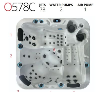 As for the O578C model, it's the epitome of performance spas, offering versatility like no other. Whether it's a cozy night in or a lively get-together, this spa adapts effortlessly. Activate all 3 pumps, and you'll experience a full-body transformation, targeting every muscle group from back to calves. Equipped with a powerful Vulcano jet as standard, it even provides targeted massages for the abdomen and hips, with adjustable power settings via a diverter valve.